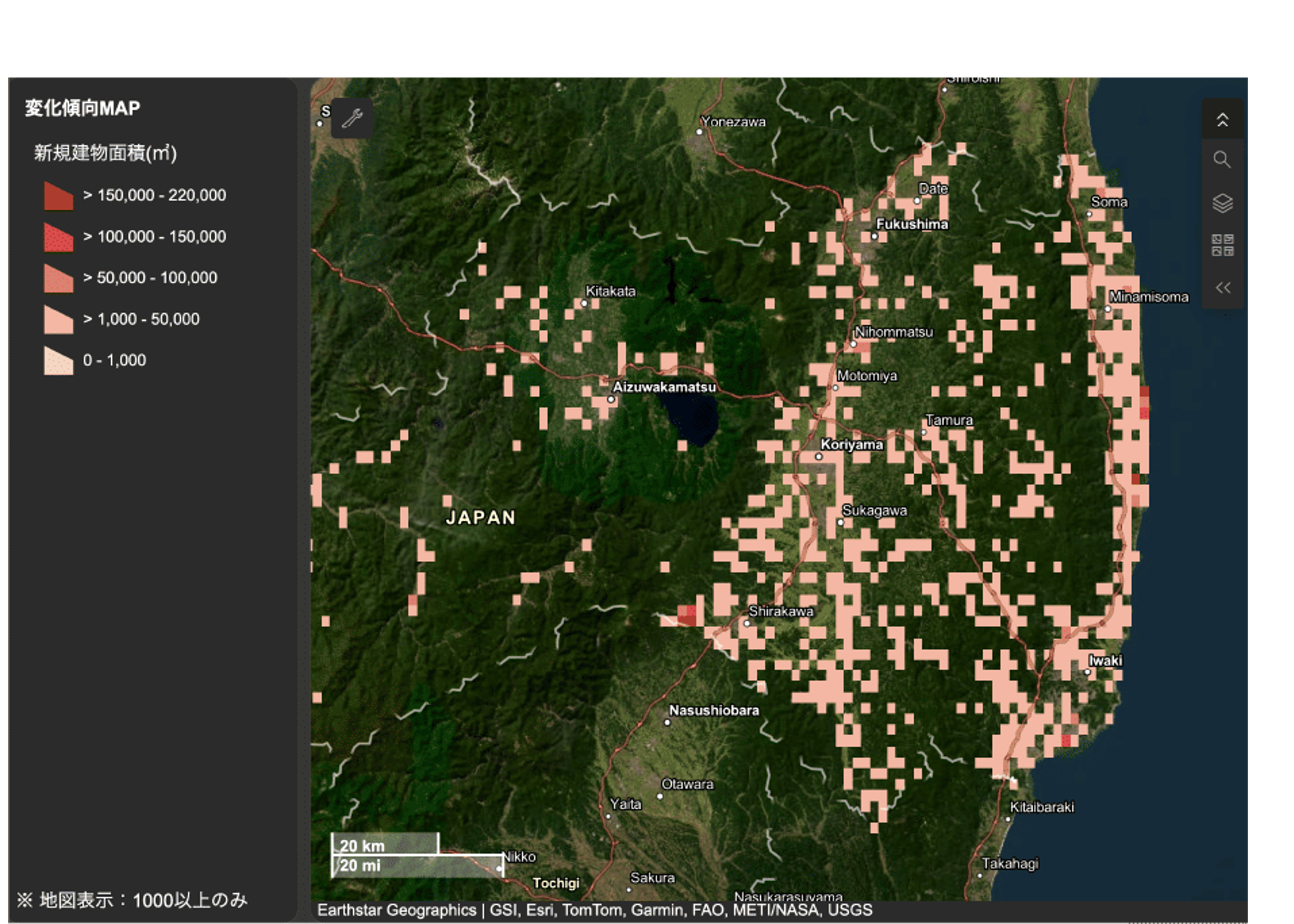 Automatically visualizes areas undergoing active land utilization and building development