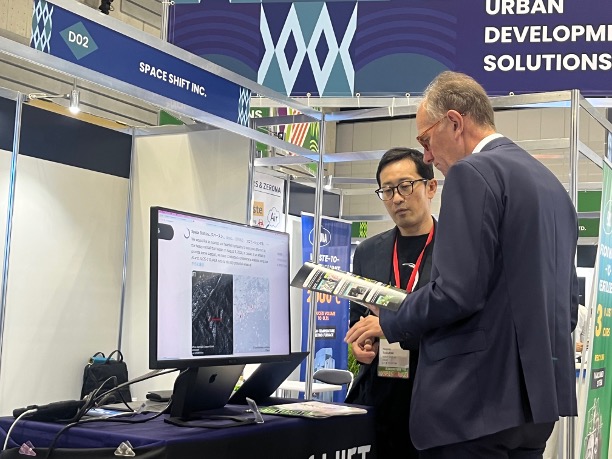 展示会場では「都市問題対策」カテゴリーにて、衛星データ解析技術を活用したユースケースを紹介しました。国内外の政府関係者、国際機関、民間企業から多くの方がご来場され、農業・防災・都市インフラといった多様な領域における衛星データ活用の可能性について高い関心を寄せて頂きました。