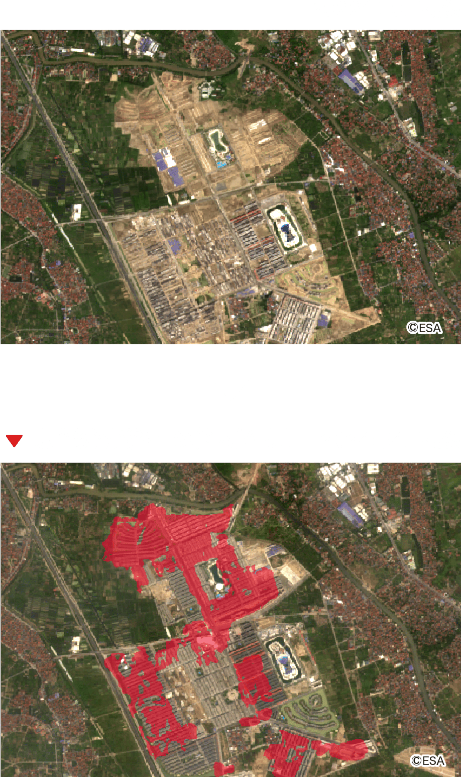 A 建築や解体などの変化があった建物を検知対象としています。一方で、SARおよび光学衛星データ上において、建物の変化に類似した特徴が検出された場合、AI判定時に誤検知が発生する可能性もございます。