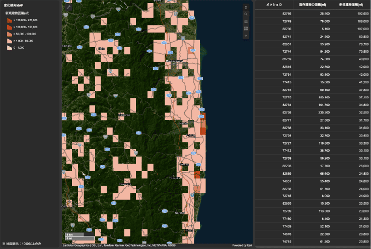 衛星データ × AIにより、指定エリア内の建物の新設・解体にともなう変化傾向の情報をご提供するサービスです。 ご指定いただく2時期の比較結果をメッシュ単位で数値化し、都市開発の動向把握・不動産の評価や監視・防災計画等に活用可能です。