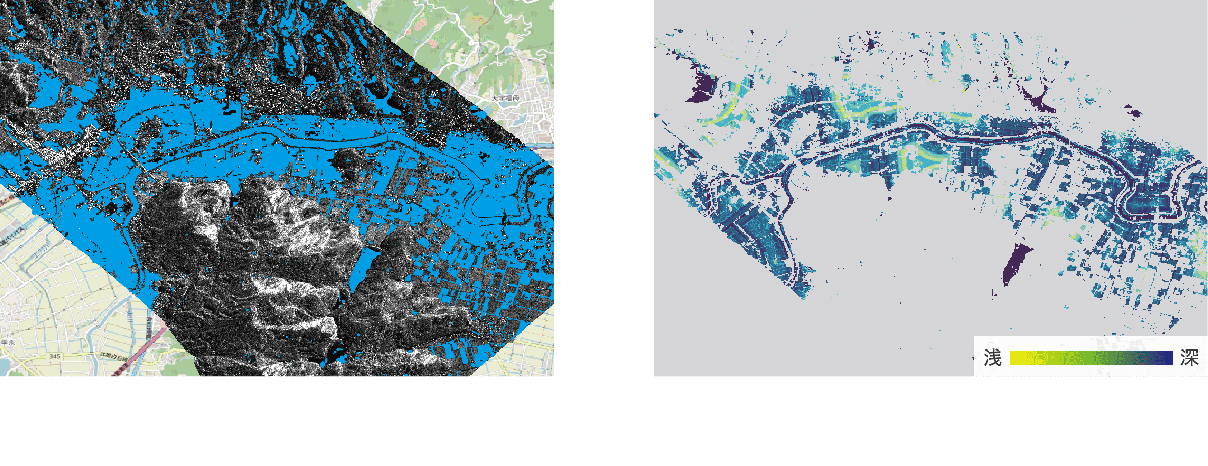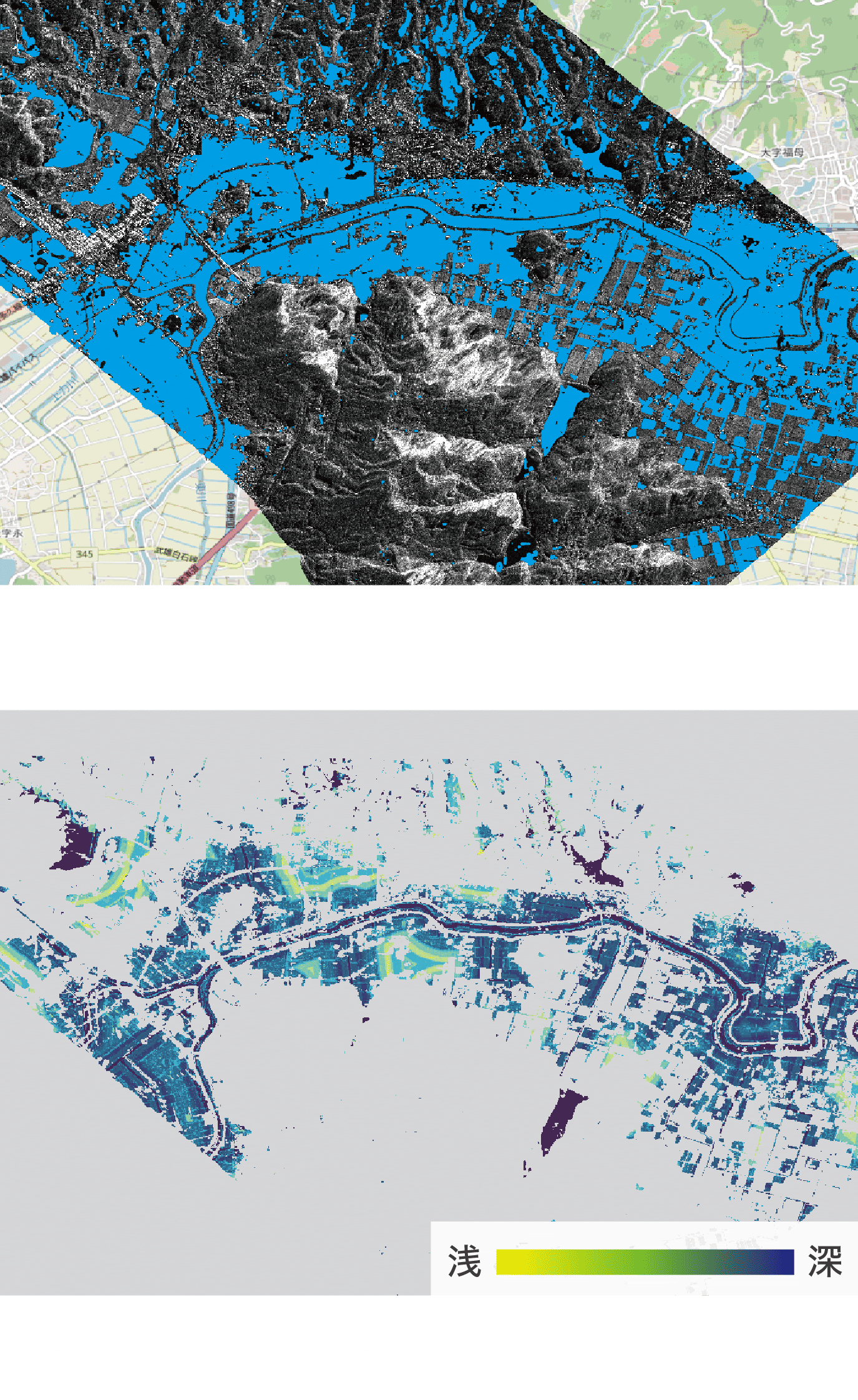 A 浸水の範囲および浸水の深さ、土砂崩落の箇所を検知可能です。