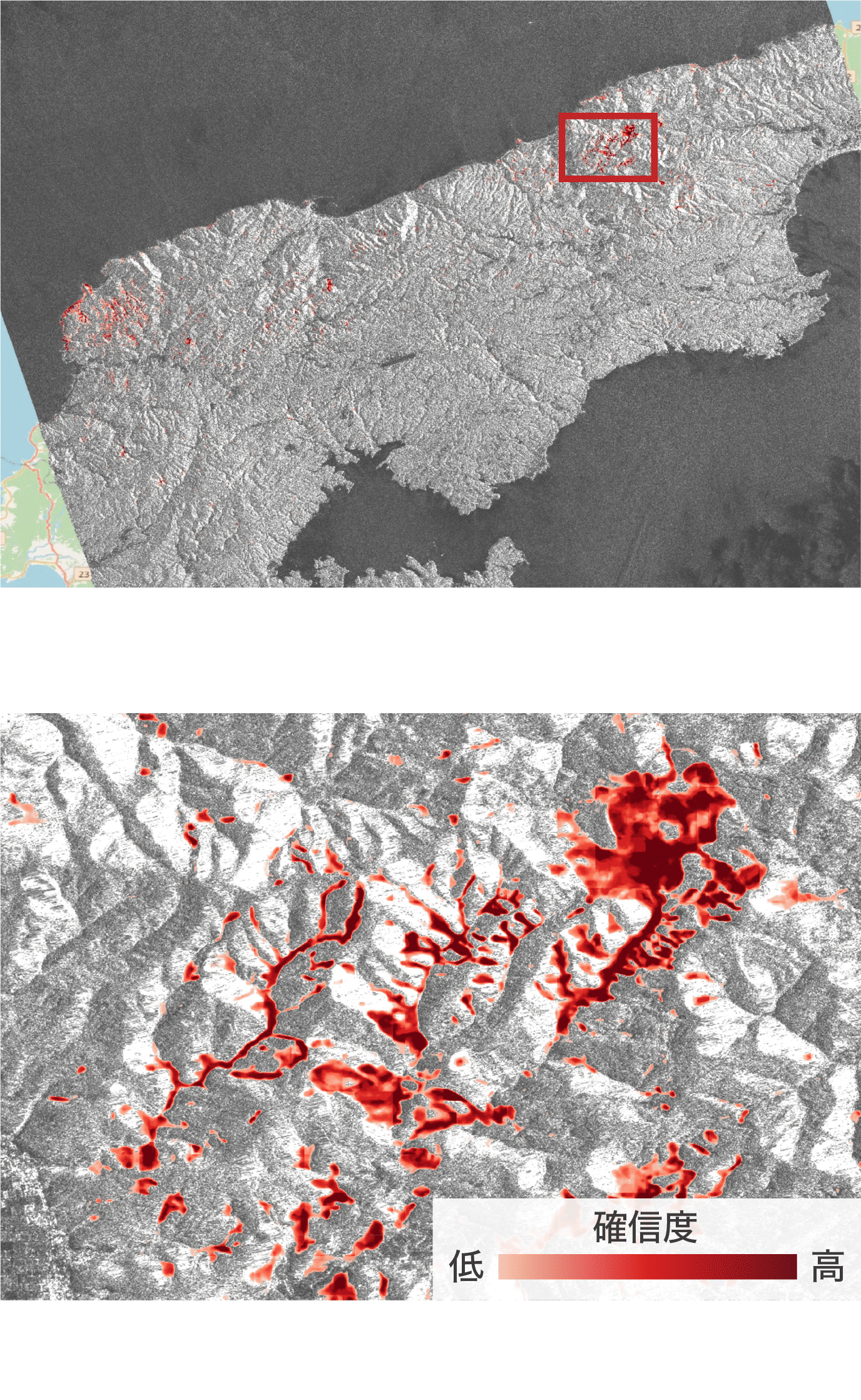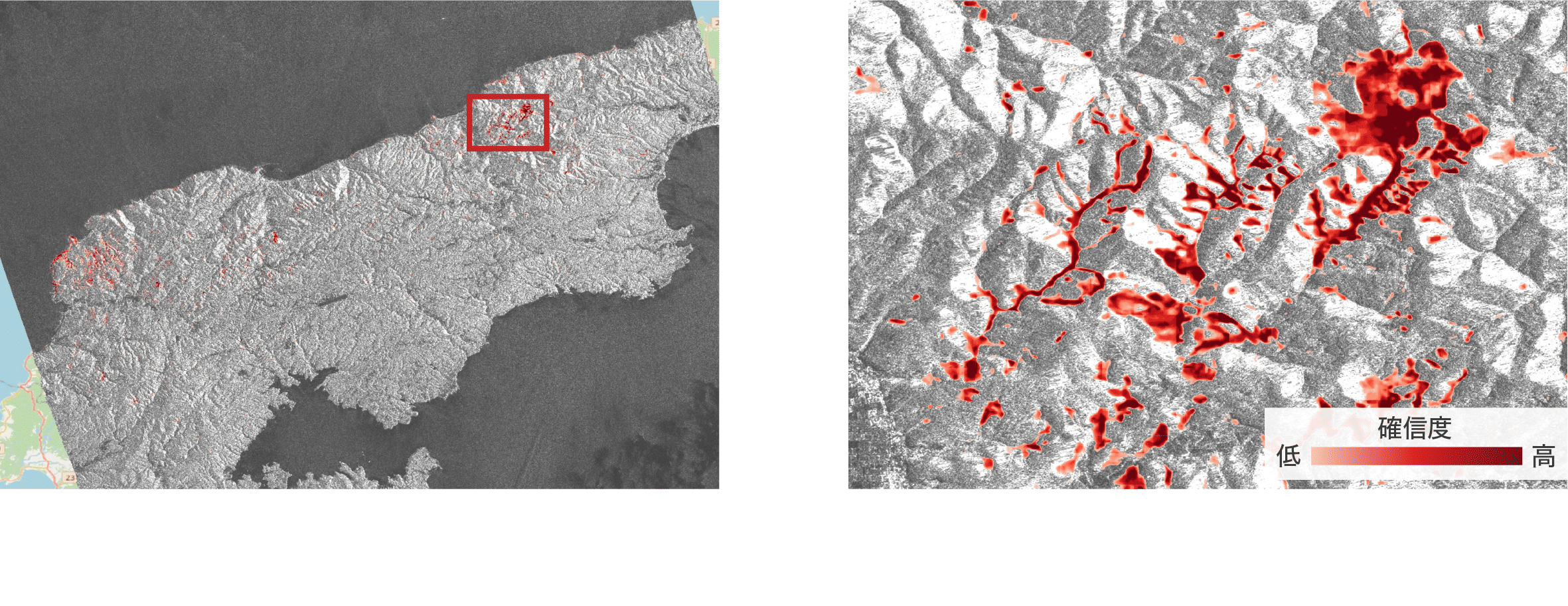発災前後の2時期のALOS-2のデータから、土砂崩落が発生した箇所を検知。AIが推定した土砂崩落の確率(確信度)をご提供。